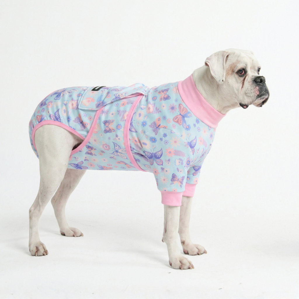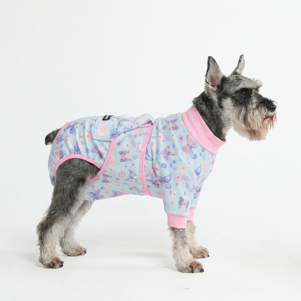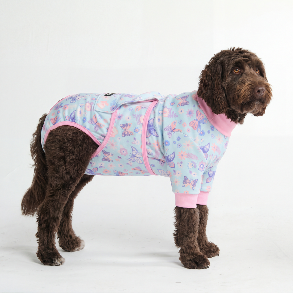 「エリザベスカラー」によるストレスをなくし、快適なリカバリータイムを。当社の術後ウェアは、愛犬の自由な動き、食事、睡眠を妨げることなく、患部をやさしく保護します。