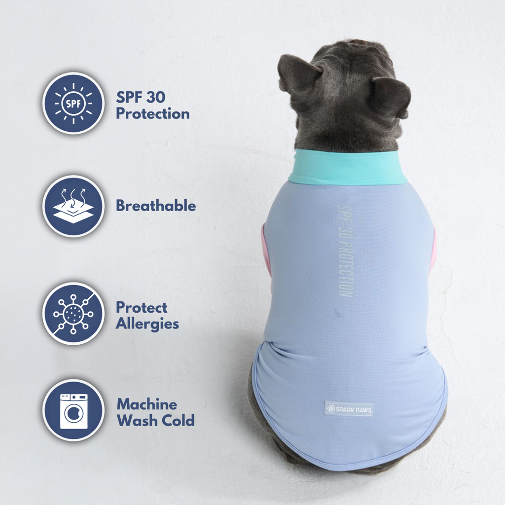 SPF-30サンブロックドッグTシャツで犬を太陽から守ります。有害なUVB線の97%をブロックしながら、犬を清潔でアレルゲンフリーに保ちます。
